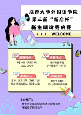 (图文/张可可)2024年3月29日晚,成都大学外国语九游官方网站的第三届“新启杯”新生辩论赛终于圆满落下帷幕,这是一场智慧与激情的碰撞,一场思维与口才的较量!