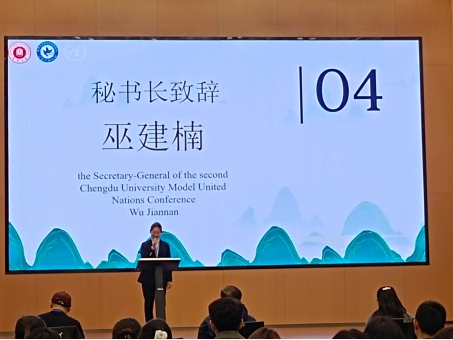 接下来,秘书长巫建楠上台发言。巫建楠表示虽然成大模联成立的时间不久,但是成大模联在积极与全国各大高校模联协会相互交流学习,积累点滴进步。本届大会,我们将秉持“模以为学,联以为术”的宗旨,坚持模联的本质与精髓,本着学术至上的精神,致力于使各位代表拥有最佳的参会体验;不驰于空想,不骛于虚声,预祝第二届成都大学模拟联合国大会圆满举办。
