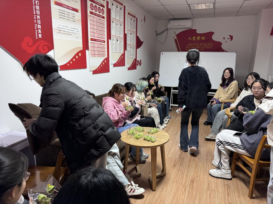 活动现场,同学们共同品尝清明节传统食物青团。青团以艾草汁染制的碧绿外皮象征自然生机,圆润造型呼应团圆之意,红豆、芝麻等内馅则寄托对先人的缅怀之情。通过实践体验,参与者直观感受了传统饮食文化中“以食寄情”的智慧,并围绕青团的历史渊源与地域差异展开交流。