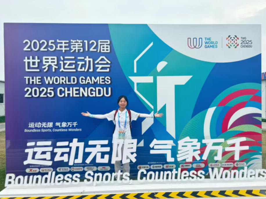 “世运会颁奖礼仪工作,是我走出书本学到的最生动实践课。为了呈现最佳状态,我每天反复打磨细节 —— 递奖牌的角度要精准,微笑的弧度要自然,从最初面对国际友人时的紧张局促,到后来服务中的从容得体,我逐渐读懂 “礼仪” 二字的深层含义:它不只是标准的姿态,更是对运动员汗水与拼搏的尊重,是对每一份梦想的真诚祝福。印象最深的是一位白发苍苍的运动员,当他双手接过奖牌、眼中绽放出喜悦光芒时,我忽然明白:我们递出的不只是一块奖牌,更是对岁月里每一份坚持的致敬。这段经历珍贵而难忘,必将成为照亮我未来前行之路的光。”