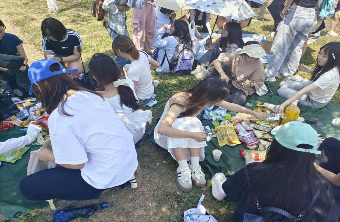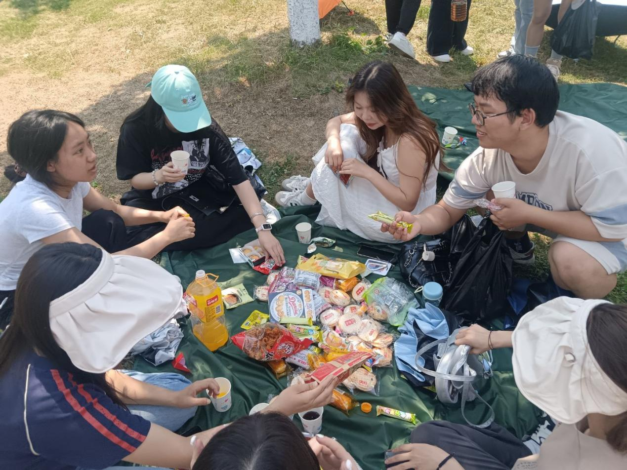 游戏间隙,大家围坐在野餐垫旁,分享着精心准备的美食,在轻松惬意的氛围中畅谈生活与学习,进一步拉近了彼此的距离。