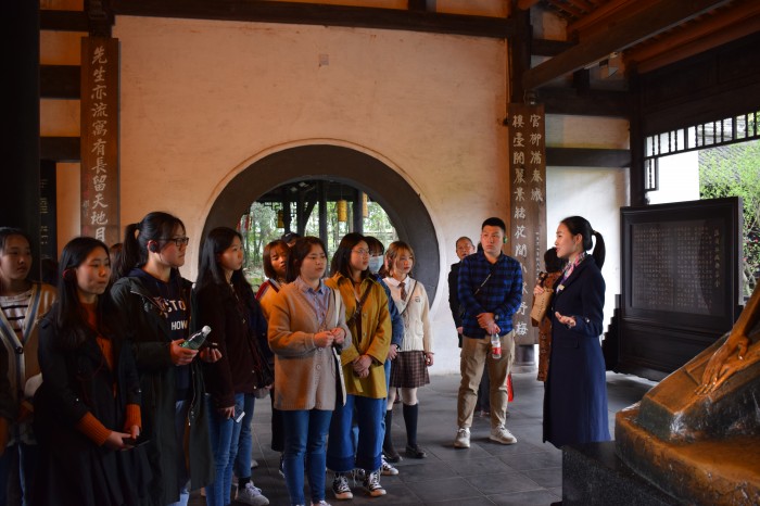 下午两点,参加志愿者讲解培训的同学们到达杜甫草堂博物馆北门,随后,工作人员为参加志愿者培训的同学们分发了讲解器,在讲解员的带领下,同学们依次进入草堂,通过讲解员的讲解,同学们了解到许多关于杜甫的历史故事,知识也得到了丰富。