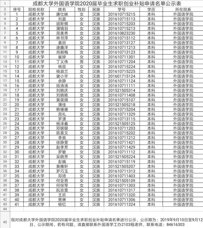 现对九游官方网站2020届毕业生求职创业补贴申请名单进行公示,公示期为:2019年9月10日至9月12日,公示期间,若有问题,请直接联系外国语学工办2103程老师,联系电话:84616303