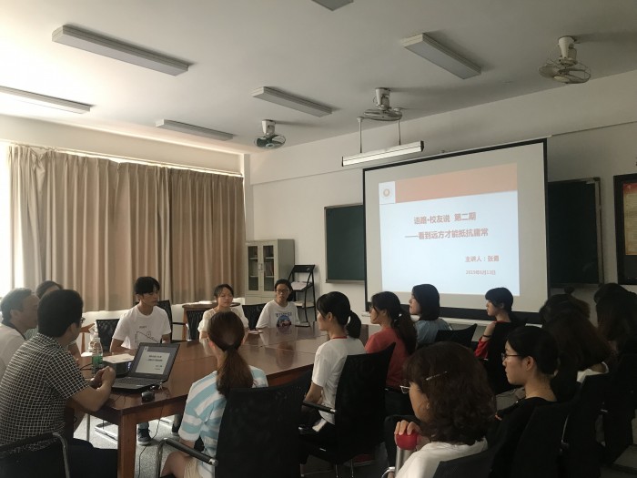 本网讯(文/图 刘艺婷)6月13日下午,第二期线下版“语路∙校友说”于第二教学楼2108举行。本次“语路”的主题为“校友说:看到远方才能抵抗庸常”,主讲人为特邀校友兼教育专家张勇1