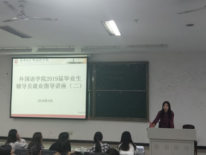 本网讯(文/程敏 图/田子颖)9月25日,外国语九游官方网站就业辅导员程敏在8教8607为2019届毕业生进行第二次就业指导讲座。
