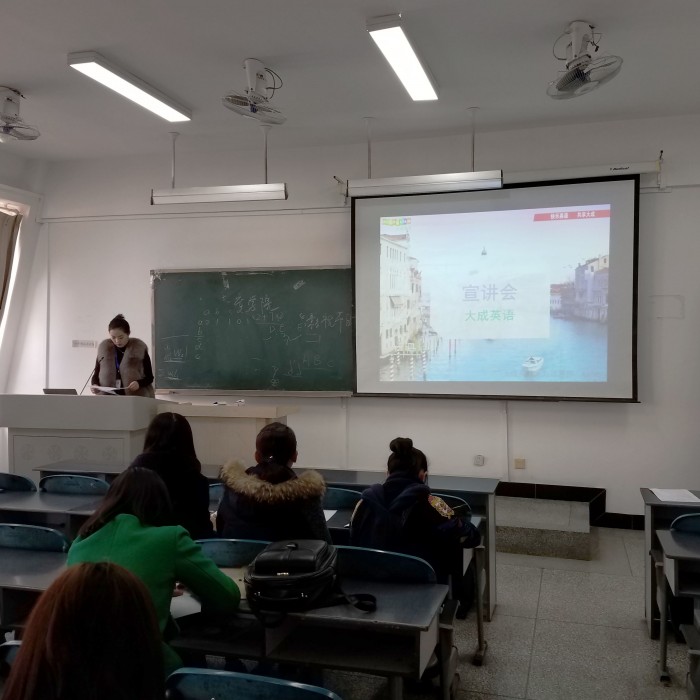 宣讲会伊始,蒋老师首先提出大成英语始终坚持以教学为中心,并大致介绍了大成英语的文化理念氛围,简要分析了当前社会的就业形势和社会教育发展方向。蒋老师通过询问学生们应届毕业生最关注的内容、未来规划等了解学生们的需求和意向。之后,蒋老师告诉大家了大成英语的生源范围在小学到高中,有充分的就业机会,然后介绍了大成英语单位的地址布局和发展历史,还讲解了“大成”名字的含义即:海纳百川,有容乃大;成人达己,修己安人。蒋老师向学生们展示了各种大成英语的活动照片,提出了大成英语的蓄水池人才培养战略。