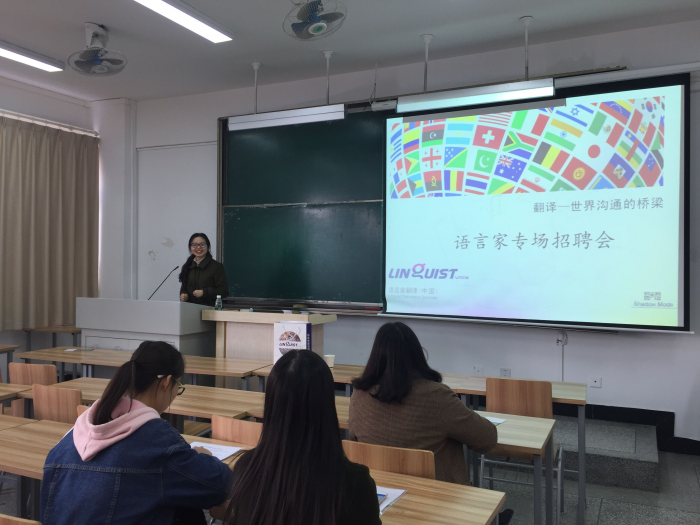 宣讲会开始,宣讲人首先介绍了该企业。语言家翻译社创立于2007年,是中国最具规模的全球性高端语言服务及国际交流合作促进机构。目前在全球范围内设有成都翻译基地,北京商务中心,上海商务中心,西安商务中心等基地。十年来语言家为2万余家客户提供了涉及40多个专业领域的资料翻译,同时为一万余场外交外事,国际经贸文化交流活动提供了语言服务和资源支持,服务范围涉及全球30多个国家。