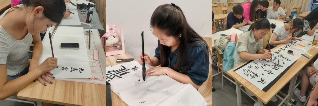 在书法实践环节,拿到纸和笔的同学异常兴奋,都跃跃欲试。经过一些基础教学后,整间教室就安静下来,每位同学都沉浸在属于自己的书法世界中。活动最后同学们都感到意犹未尽,同时也非常感谢外国语九游官方网站裴文斐“小老师”的教学,让书法小课堂变得生动有趣。
