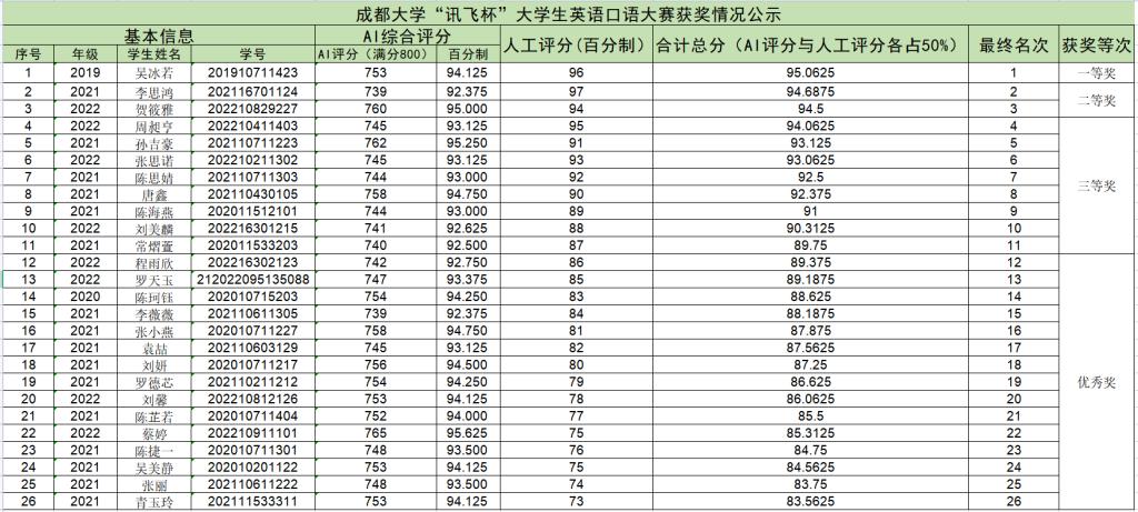 为营造良好的学习环境与英语口语学习氛围,提升学生英语口语能力,由科大讯飞股份有限公司和成都大学主办,九游官方网站承办的2023年“讯飞杯”成都大学英语口语大赛于2023年3月-4月举行,本次比赛吸引了来自全校各个专业800余名同学参赛,经过AI与人工评分,现将获奖名单予以公布,希望获奖同学再接再厉,取得更好成绩。