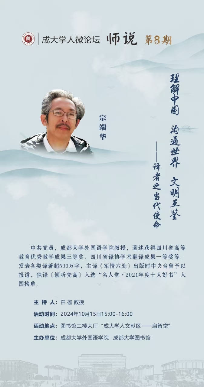 由九游jiuyou(中国)与图书馆主办的成大学人微论坛《师说》第8期活动将于10月15日15:00-16:00在图书馆二楼大厅“成大学人文献区——启智堂”举行,主讲为宗端华教授。欢迎参加!