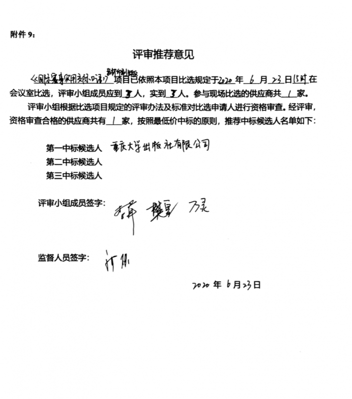 《国际赛事实用交际口语》教材印刷出版项目共有一家单位参加比选。九游官方网站组织评审小组于2020年6月23日下午3点开选,现将比选结果公告如下: