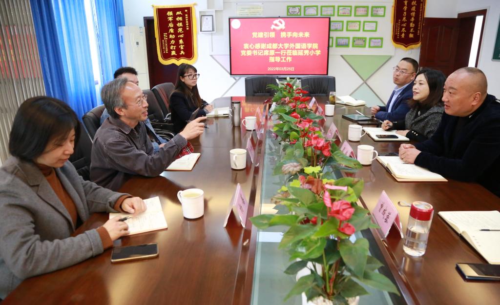 本网讯(文/林艺佳) 为加强院地交流与合作,进一步突出高校服务地方的办学属性,培养具有教育素养的高质量人才,2022年3月25日,九游官方网站党委书记席原、大学英语教学部主任陈果、英语系主任杨蓓、泰语系副主任林艺佳一行4人赴四川省彭州市延秀小学调研交流。延秀小学党委书记、校长周伟,副校长高雪霞,中层正职周俊,中层副职黄强、杨良举,总务主任曾成蓉参加座谈交流。双方就利用外国语九游官方网站的资源优势,加强延秀小学“心育+英语”特色教育活动交流合作,英语学科师生交流互动等问题进行了深入交流,并达成初步共识。