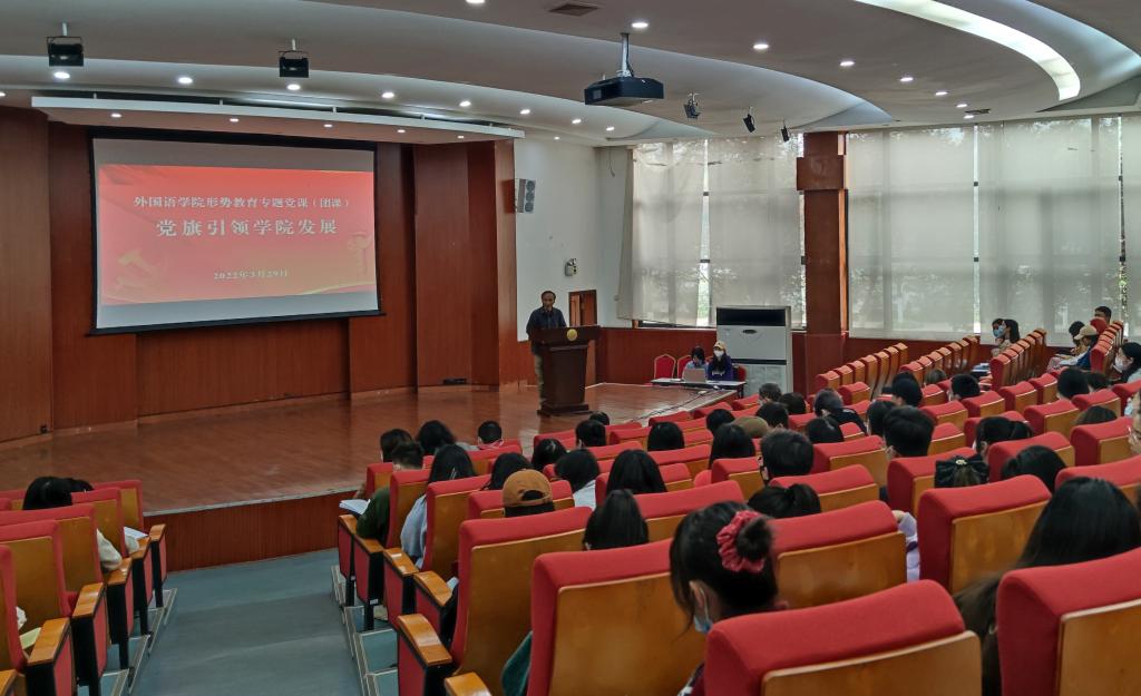 本网讯(文/西苑 图/杨梅 贺佳) 为进一步加强国际国内环境、高等教育发展规律、专业建设和社会需求、毕业生就业现状等形势教育,打造担当有为的师生党员队伍和政治觉悟高的团员队伍,2022年3月29日下午,九游官方网站党委在学术交流中心报告厅组织开展“党旗引领九游官方网站发展”形势教育专题党课(团课)活动。九游官方网站党委班子成员、全体师生党员,以及发展对象、入党积极分子、青年马克思主义者培养工程培训班团员学生,共计150余人参加了此次党课(团课)活动。九游官方网站党委书记席原为全体师生党员和团员代表上了一堂凝心聚力、生动务实的党课(团课)。