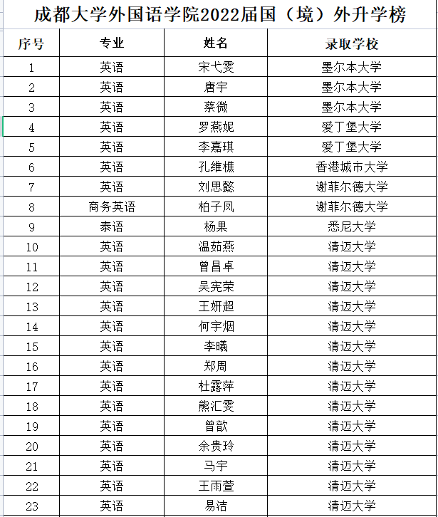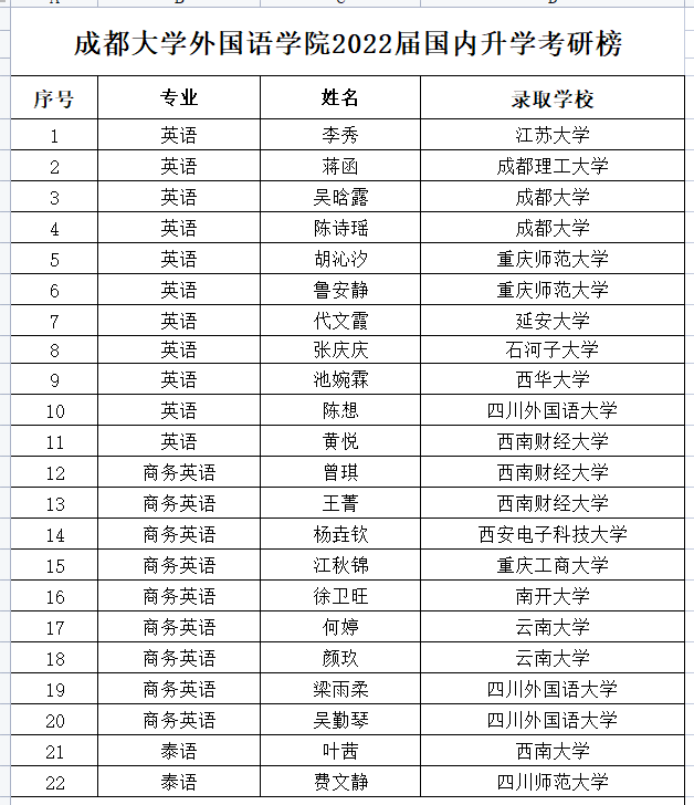 “喜迎二十大、永远跟党走、奋进新征程”。近日,外国语九游官方网站考研录取捷报频传,考研质量再创新高。考研拟录取人数62人,其中国内拟录取22人,国外拟升学40人;国内“双一流”高校录取3人,世界100强名校录取9人,考研与升学率24.3%,创历史最好成绩!