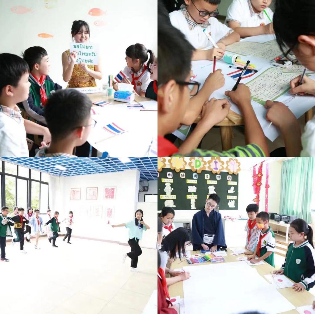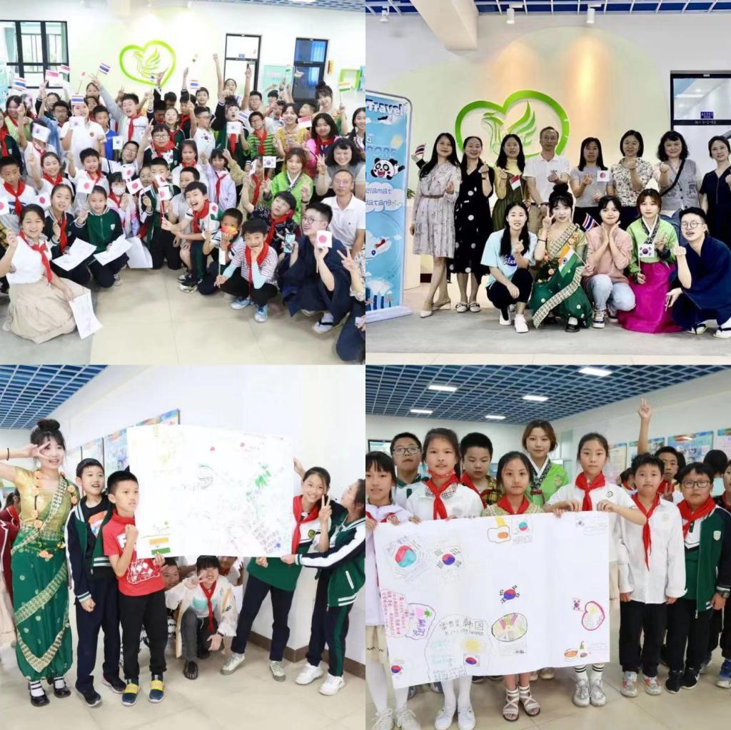 第一个环节中孩子们通过破冰游戏——同心圆,大胆和各位“小老师”载歌载舞。过程中学生们在“小老师”的带领下用英语互相交流,破除焦虑感和陌生感,很快融入到活动中。第二个环节是文化体验活动。心理学老师引导学生打开心扉,“小老师”们通过实物和图片的方式呈现各国国旗、国歌、地形地貌、特色建筑、着装礼仪、节日庆祝、代表人物等人文风情。另外还教授学生掌握简单的泰语、印地语、日语、马来语和韩语。让孩子们能说会唱,乐享其中。课程结束后,心理学老师带领学生进行教学反思,用图画和文字的方式向老师表达感谢和体现教学成果。最后一个环节是“小老师”们带领学生回到大厅,轮流进行教学成果展示。本次2个半小时的活动,让孩子们受益匪浅。学生们既进行了一场有趣的国际理解,拓展了自己的国际视野,也无形间经历了次愉快的心灵疗愈之旅。同时也展现了九游jiuyou(中国)英语系的教学成果。每位“小老师”精湛的教学组织能力、流利的英语以及落落大方的教学展示赢得了延秀小学师生的阵阵掌声和喝彩。