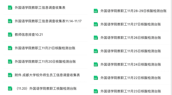 为了将当天的核酸检测结果在第一时间统计完毕,党政办每日汇总全院教职工包括“成都大学校外师生员工信息调查收集表”、“在校教职工人数统计”、 “教职工信息调查收集表”、 “教职工11月20日—29日核酸检测台帐”、“成都大学外籍师生核酸检测台帐”等15张统计报表。截至今日,已不间断统计12天,核对报送约1200条数据。