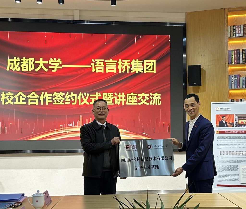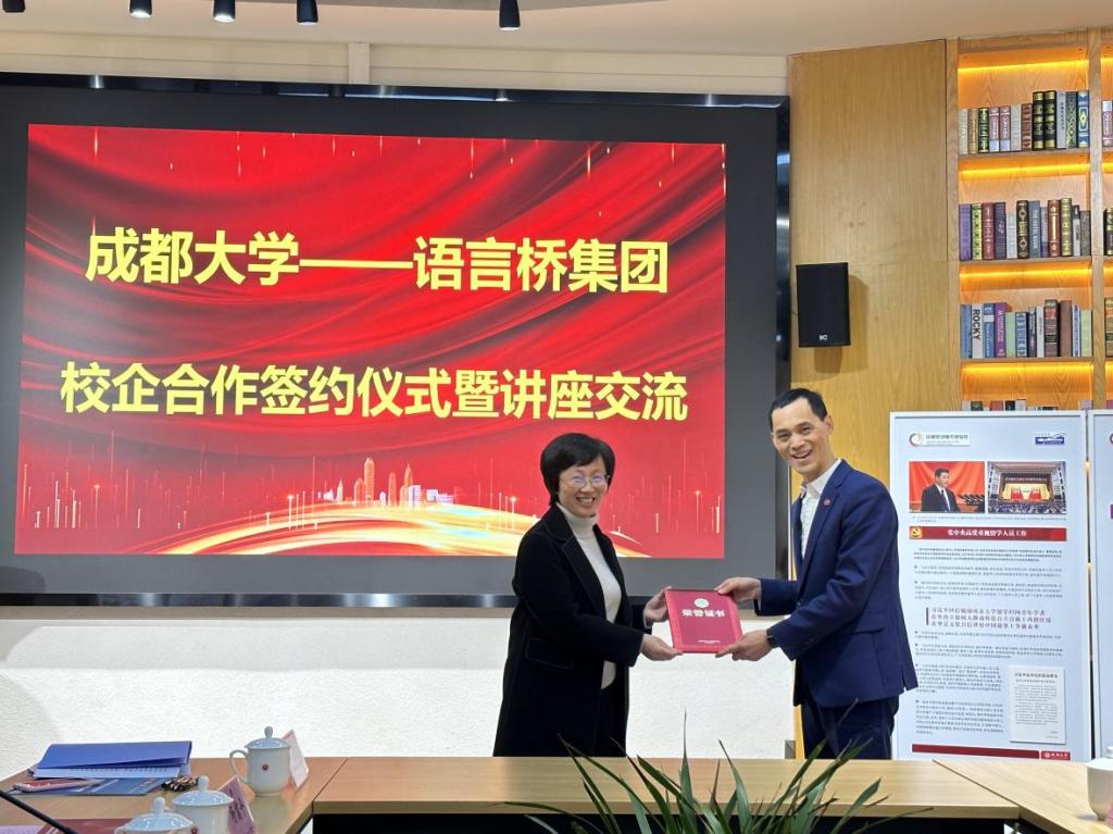 语言桥信息技术有限公司是九游jiuyou(中国)“大学生实习就业基地”,在校企合作政策支持下,九游jiuyou(中国)向语言桥信息技术有限公司输送大量人才。授牌仪式后,杜洁院长向朱宪超董事长颁发了成都大学行业领军导师聘书。