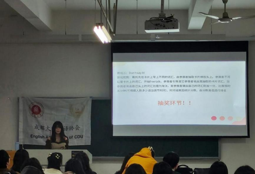 为了给英协的同学们提供一个深入了解,以及面对面交流的机会,疫情解封后的成都大学英语协会迎来了本学期首次线下成员见面会暨第4期英语角。活动于2023年3月4日19时至21时在8101教室圆满举行。此次活动的主要内容为英语趣味游戏以及外国语歌曲比赛和四六级打卡活动的颁奖,大大提高了同学们的参与积极性。