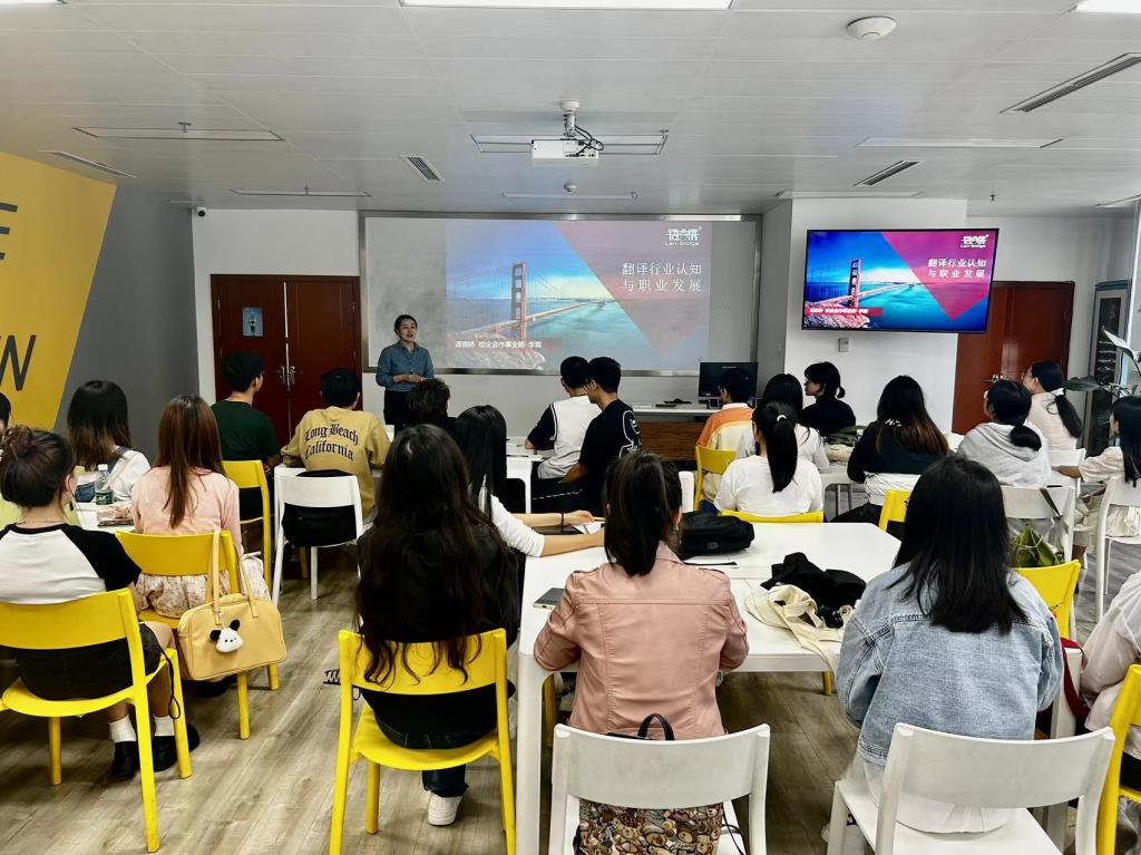 首先是由语言桥集团校企合作事业部总监李璐向同学们介绍了当前语言服务行业现状及发展前景、语言服务行业的发展特征、市场规模、中国机遇。同时李璐总监也谈到了目前的一些语言服务岗位,强调当今语言服务注重“localization”,即本地化。最后李璐总监向同学们阐述了当前语言服务行业面临的挑战,交流的全球化也意味着竞争的全球化,她也鼓励同学们多参加大型的国际会议,走出校园,参加实习实践,比如参加今年10月即将在成都举行的世界科幻大会,从实践中获取经验。
