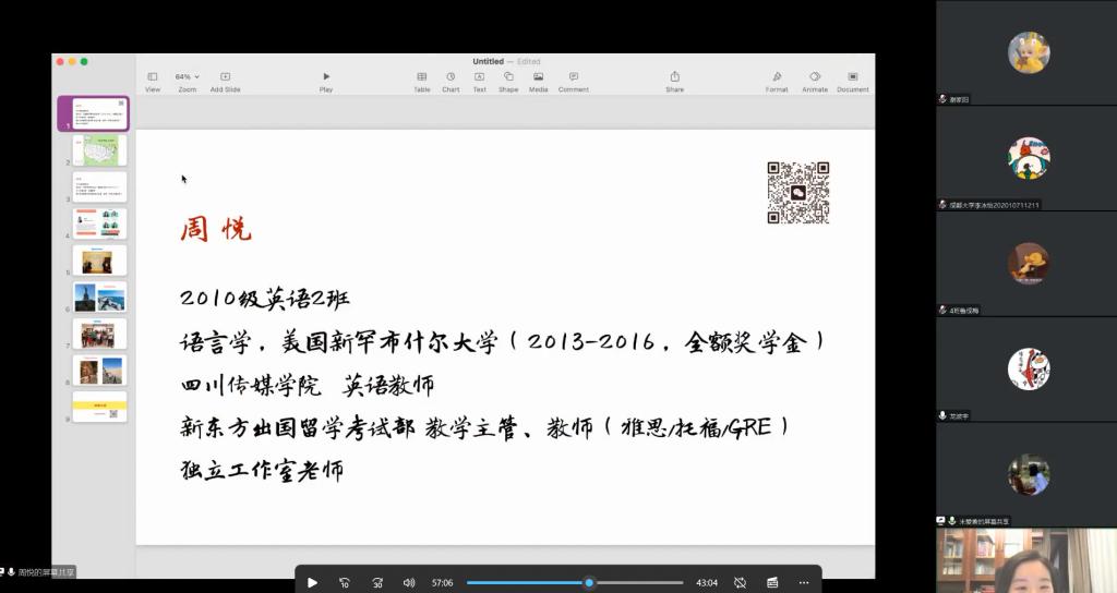 第一位邀请到的是硕士毕业于自英国爱丁堡大学的2015级英语专业毕业生钟雨彤。她以摄影为出发点,通过摄影的故事来诉说了自己留学时的所见所闻,充分展现了英国留学生的丰富生活,也为其他想前往英国留学的同学提供了宝贵的经验总结和生活体验。第二位进行交流的是2011级英语专业毕业生,现于泰国清迈大学博士在读的刘鑫,他客观地分析了清迈大学的学术氛围,中泰之间的文化差异,同时也聊到了大家较为关心的学费学制问题。接下来为我们分享的是来自2015级英语专业毕业生、硕士毕业于香港城市大学的米爱香,她从个人经历出发给出了职业规划的建议,同时鼓励同学们放宽视野,努力提升自己。