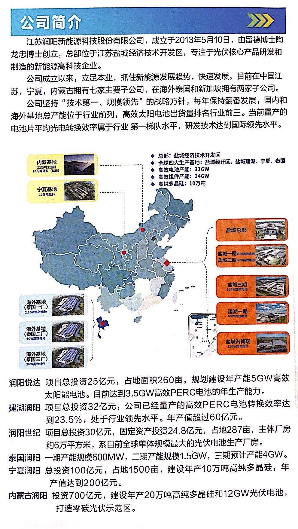 企业介绍:江苏润阳新能源科技股份有限公司成立于2013年,位于盐城经济技术开发区,专业从事太阳能电池的研发、制造和应用。目前公司太阳能电池片销量位居全球前三位,系全球最具竞争力的光伏企业之一,全国重点国有企业江苏悦达集团战略入股。 公司创始人陶龙忠博士汇聚了一批来自于德国Fraunhofer-ISE、德国ISFH研究所、中山大学-ISE及行业一流企业中的年轻精英,努力打造技术领先、品质卓越的太阳能产品,荣获殊荣江苏省独角兽企业,是苏北地区首家。 公司秉承“科技改变世界、光伏守护地球”的使命,致力于实现给社会创造财富价值和清洁能源的企业愿景。