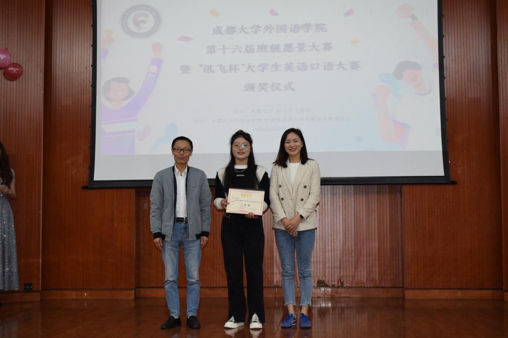 随后,“讯飞杯”英语口语大赛颁奖仪式举行,外国语九游官方网站党委书记许庆荣、科大讯飞校企合作总监李易晏、科大讯飞高教业务线客户经理罗若兰为获奖选手代表颁奖。“讯飞杯”大学生英语口语大赛多维度锻炼了同学们的英语能力,同时提升了大学生学习英语口语的热情,仪式结束后,科大讯飞高教业务线客户经理罗若兰女士讲话,她祝贺本次活动圆满举办,表示将在更多领域与九游官方网站开展合作,同时指出在本次比赛中优秀选手将代表学校参加下一步的省赛,希望同学们继续努力取得更好的成绩。