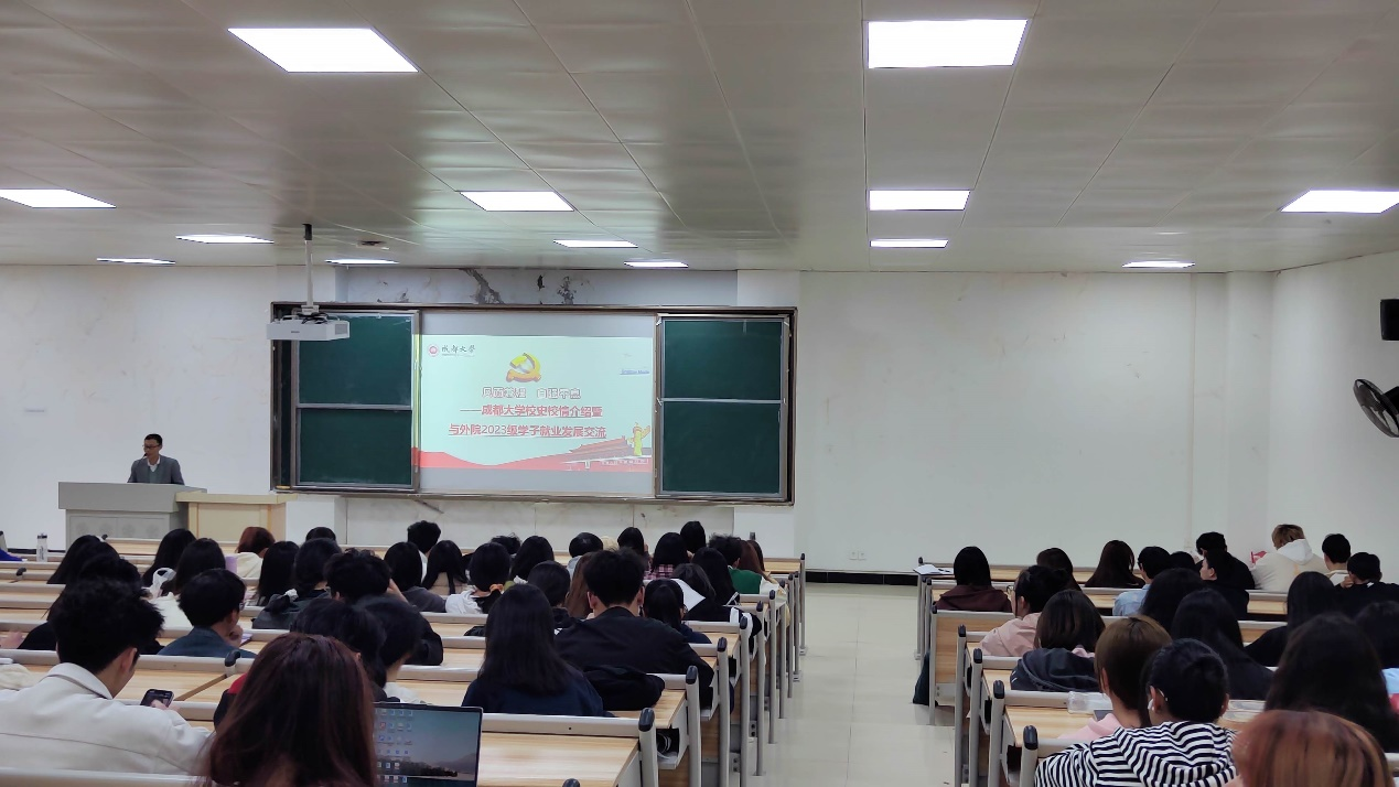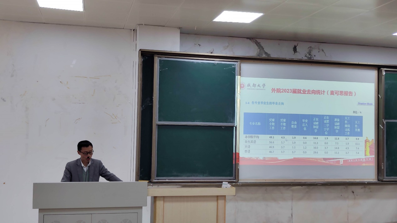 接着,许庆荣详细列举了外院往届毕业生的就业情况,分析了包括毕业去向以及地域分布、行业分布、薪资范围等数据。他用直观的数据,让学生们对就业市场有了更为深刻的认识。在分享这些数据的同时,书记也不忘鼓励学生们要有信心,面对挑战时要勇于尝试,不断探索适合自己的职业道路。