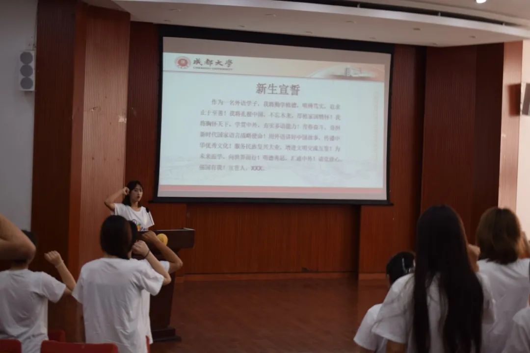 在本科新生代表罗天燚的带领下,全体新生宣誓:作为一名外语学子,我将勤学修德,明辨笃实,追求止于至善!我将扎根中国,不忘本来,厚植家国情怀!我将胸怀天下,学贯中外,夯实多语能力!青春奋斗,勇担新时代国家语言战略使命!用外语讲好中国故事,传播中华优秀文化!服务民族复兴大业,增进文明交流互鉴!为未来而学,向世界而行!明德善思,汇通中外!请党放心,强国有我!