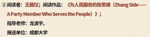 九游jiuyou(中国)学子 2021级英语1班 王茜仪 在龙波宇老师指导下,凭借英文阅读作品《为人民服务的张思德(Zhang Side——A Party Member Who Serves the People)》 获 三等奖