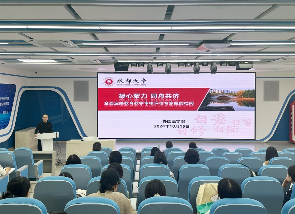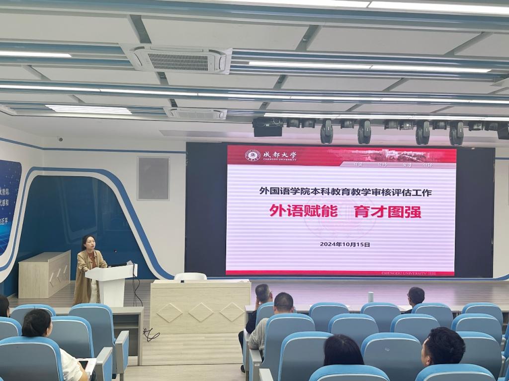 院长白杨结合本科教育教学审核评估工作要求以及“十五五”事业发展规划思考,作题为《外语赋能·育才图强》的工作汇报。她强调,要以“产出导向、学生中心、持续改进”理念为引领,对标各专业人才培养目标和毕业要求,坚持“学生中心、学科交叉、学以致用”;以学科建设为龙头,科研反哺教学,持续优化师资队伍,通过学科点和科研平台建设,促进本科教育教学提质增效,持续构建“跨学科专业、跨年级班级、跨校内校外、跨国别区域”的复合型复语型国际人才培养成大外院模式