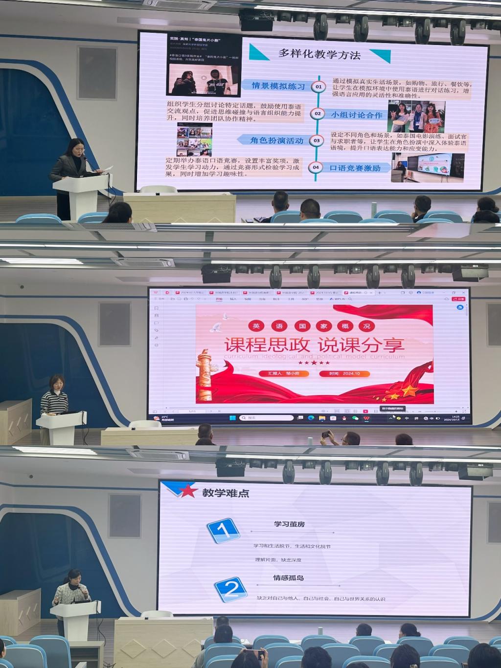 会上,泰语系林青、英语系邹小奕、商务英语系郭粒粒等老师分别代表各系部,结合课程思政、教学难点与重点、多样化教学方法等,进行了精彩的说课演示。