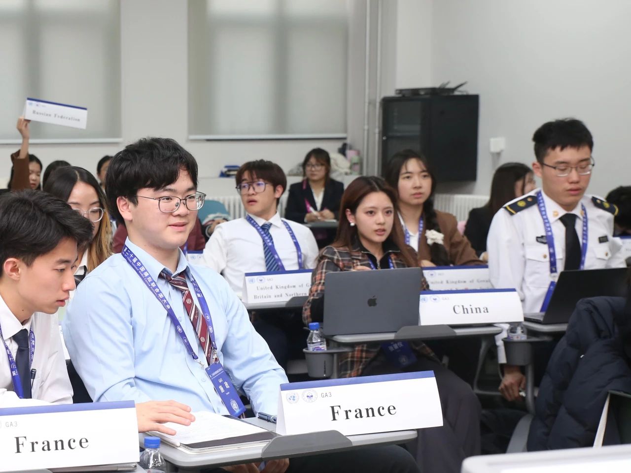 大会期间,来自各大高校的同学们按照自己代表的国家立场围绕各委员会议题展开激烈的讨论与合作。张馨仪和杨培琳同学分别在“联合国第三委员会United Nations General Assembly Third Committee (UNGA3)”和“联合国预防犯罪和刑事司法委员会United Nations Commission on Crime Prevention and Criminal Justice (CCPCJ)就“Refugee Resettlement and Human Rights Protection for Displaced Persons in War-torn Conflict Areas”(战乱冲突地区的难民安置与流离失所者的人权保障)和“Fighting New Types of Crime Using Artificial Intelligence”(打击利用人工智能手段的新型犯罪)议题与全国各大高校代表进行磋商,表现出色,受到联合国大使肯定。