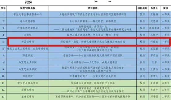 2024年11月19日,外国语九游官方网站暑期社会实践项目“轻轻推开一扇窗:特殊儿童群体多元文化交流与体验实践”在67个校级项目中脱颖而出,荣获成都大学2024暑期社会实践项目一等奖,充分展现了当代大学生的社会责任感和实践能力。这个项目以外语专业特色为基础,以“特殊儿童的多元文化之旅”为主题,深入社会特殊儿童群体,旨在通过实际行动推动特殊群体教育公平的普及。