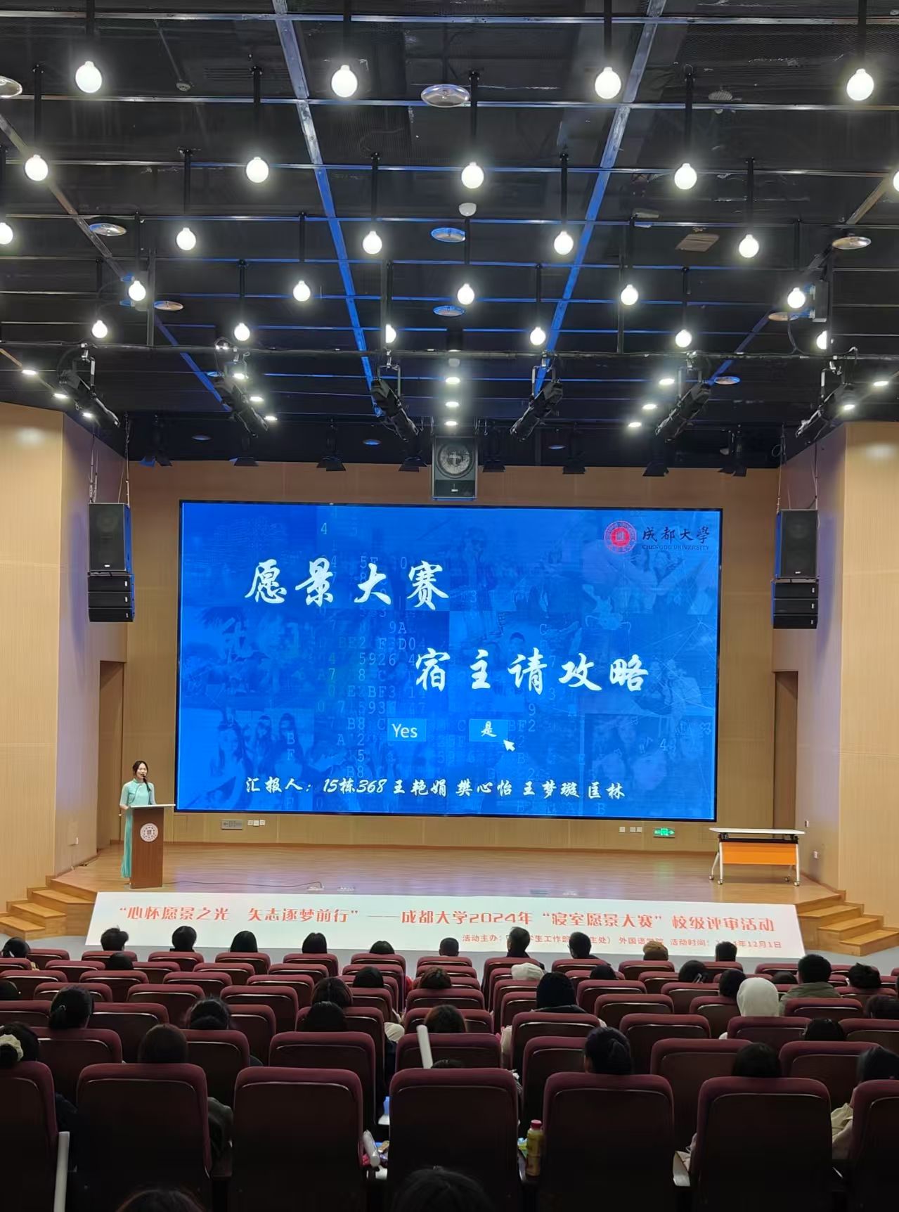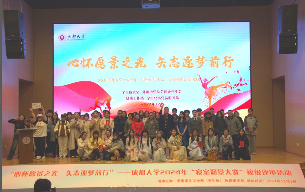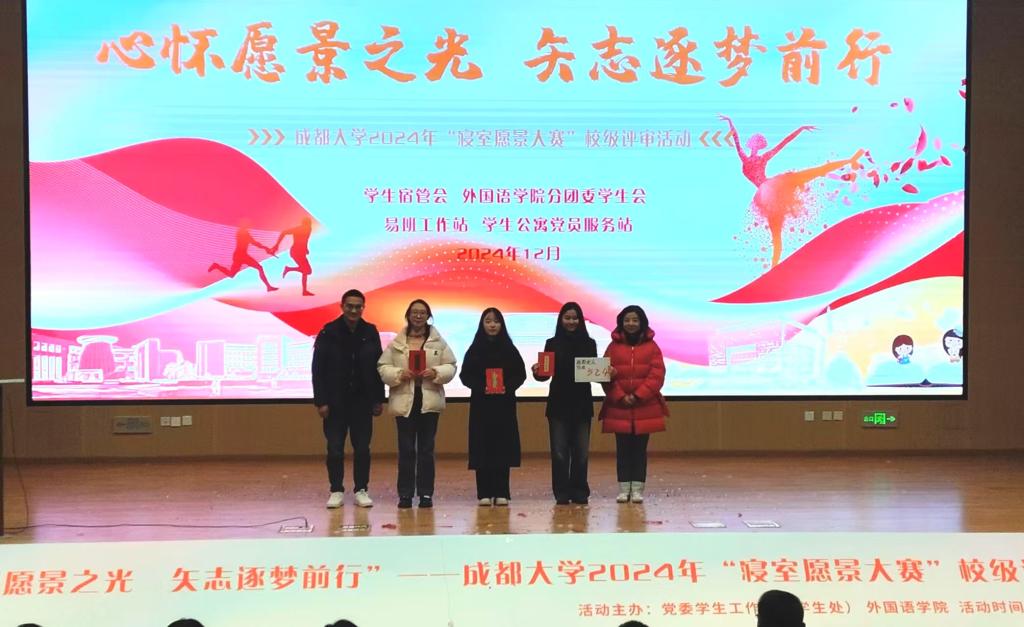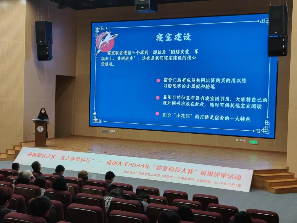 本网消息(图/任笑迎 文/穆怀文)为深入贯彻习近平新时代中国特色社会主义思想,培养学生自信自强,守正创新,掉厉奋发精神,鼓励学生树立远大理想,规划未来愿景,营造"安全稳定、清洁文明、和谐奋进"的学生宿舍环境和文化氛围。2024年12月1日晚18:30,由学生宿舍管理委员会主办,外国语九游官方网站、"语青舍"学生社区育人工作站承办,外国语九游官方网站分团委学生会、学生宿管会、易班工作站、学生公寓党员服务站协办的"心怀愿景之光矢志逐梦前行"2024年"寝室愿景大赛"决赛评选活动在东盟艺术九游官方网站小礼堂圆满举行。