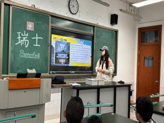 周馨月同学则聚焦于瑞士的美食和旅游景观,详细介绍了苏黎世大教堂、莱茵瀑布等标志性景点,并展示了瑞士的传统美食,如奶酪火锅和巧克力,让学生们通过屏幕感受到了瑞士的饮食文化。课堂上,学生们展现出了对瑞士文化的极大兴趣,积极参与讨论,课堂气氛十分活跃。在课程的互动环节,两位老师鼓励学生们抢答问题,并分享他们对瑞士文化的看法,同时为学生们准备了小奖品作为激励。