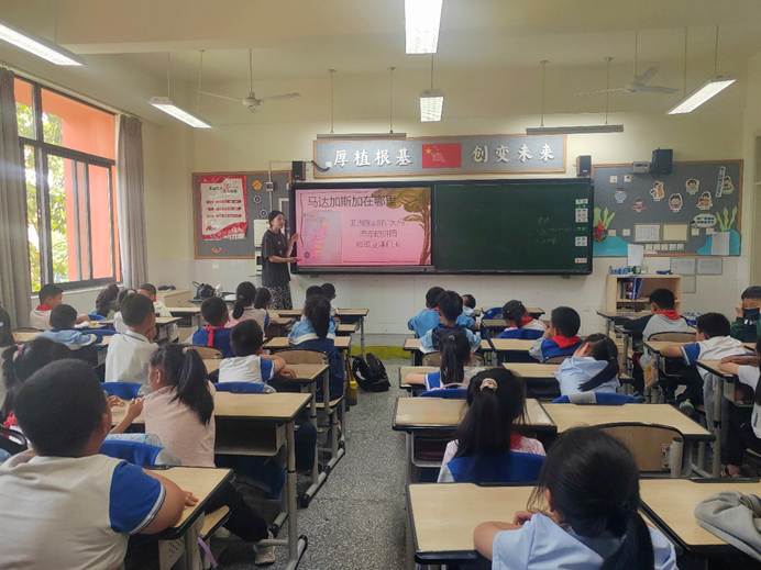 2022级英语3班的罗思彤为二年级二班的同学们带来了一场精彩纷呈的"马达加斯加探索之旅"文化课。课堂以经典动画《马达加斯加》片段开场,立即点燃了小朋友们的学习热情。通过生动的地图展示和精美图片,小老师带领孩子们认识了这个非洲最大岛屿的独特地理位置。在互动环节中,狐猴、变色龙等特有生物引发了孩子们的热烈讨论。"为什么这里的动物别处都没有?"的提问此起彼伏。小罗老师也用浅显易懂的语言为小朋友们解开了"生物孤立进化"的奥秘。课堂最后的知识问答环节,孩子们踊跃发言,争相分享学到的趣味知识。这堂充满奇幻色彩的课程,不仅让孩子们领略了马达加斯加的自然奇观,更激发了他们对世界的好奇与探索欲望。