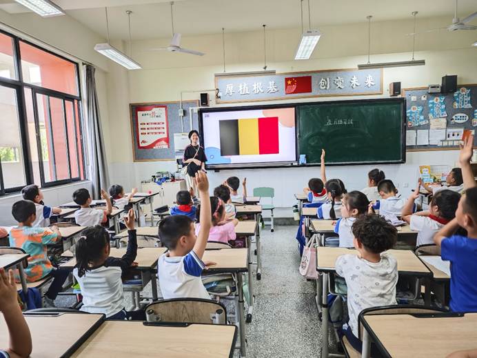 "哇!原来薯条是比利时发明的呀!"小学二年级的教室里传来阵阵惊叹声。2022级英语3班的饶静宜带来了一堂超有趣的比利时探险课!课堂上,小饶老师先带同学们玩起了"欧洲地图拼拼看"游戏,大家很快就发现比利时就像一块小拼图,夹在法国、德国和荷兰中间。当看到布鲁塞尔欧盟总部的大楼照片时,小朋友们都睁大了眼睛:"原来这么多国家是一起开会做朋友的呀!"最精彩的是放映了《丁丁历险记》动画片段。看着丁丁带着小狗白雪冒险,同学们都兴奋地举手:"老师,丁丁去过中国吗?""为什么小狗叫白雪呀?"小饶老师还准备了"比利时知多少"抢答赛,答对的同学都获得了老师的奖励!下课铃响起时,好多小朋友还围着小老师问:"比利时的小朋友也和我们一样爱吃零食吗?"