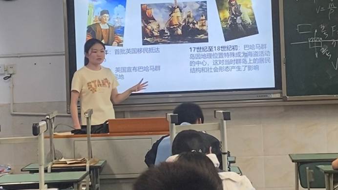 2023级英语3班的黎苹带领十陵中学初二八班的同学,开启了探索巴哈马国的奇妙旅程。课程伊始,小黎老师通过连续两个问题,引起大家的兴趣,又带着同学们在地图上找寻这个国家,生动讲解了巴哈马国的地理位置及其基本信息。然后,小黎老师图文并茂地介绍了这个国家的多个特色岛屿,如天堂岛、猪岛等等,在场的同学都因该国的美丽景色而发出惊叹。最后,小黎老师为大家深入解释了巴哈马国的文化和历史,为大家解答了“为什么这个国家说英语?”“为什么这个国家90%的人口都是黑人?”等问题。整个课堂中,同学们热情高涨,争相回答,气氛非常活跃。