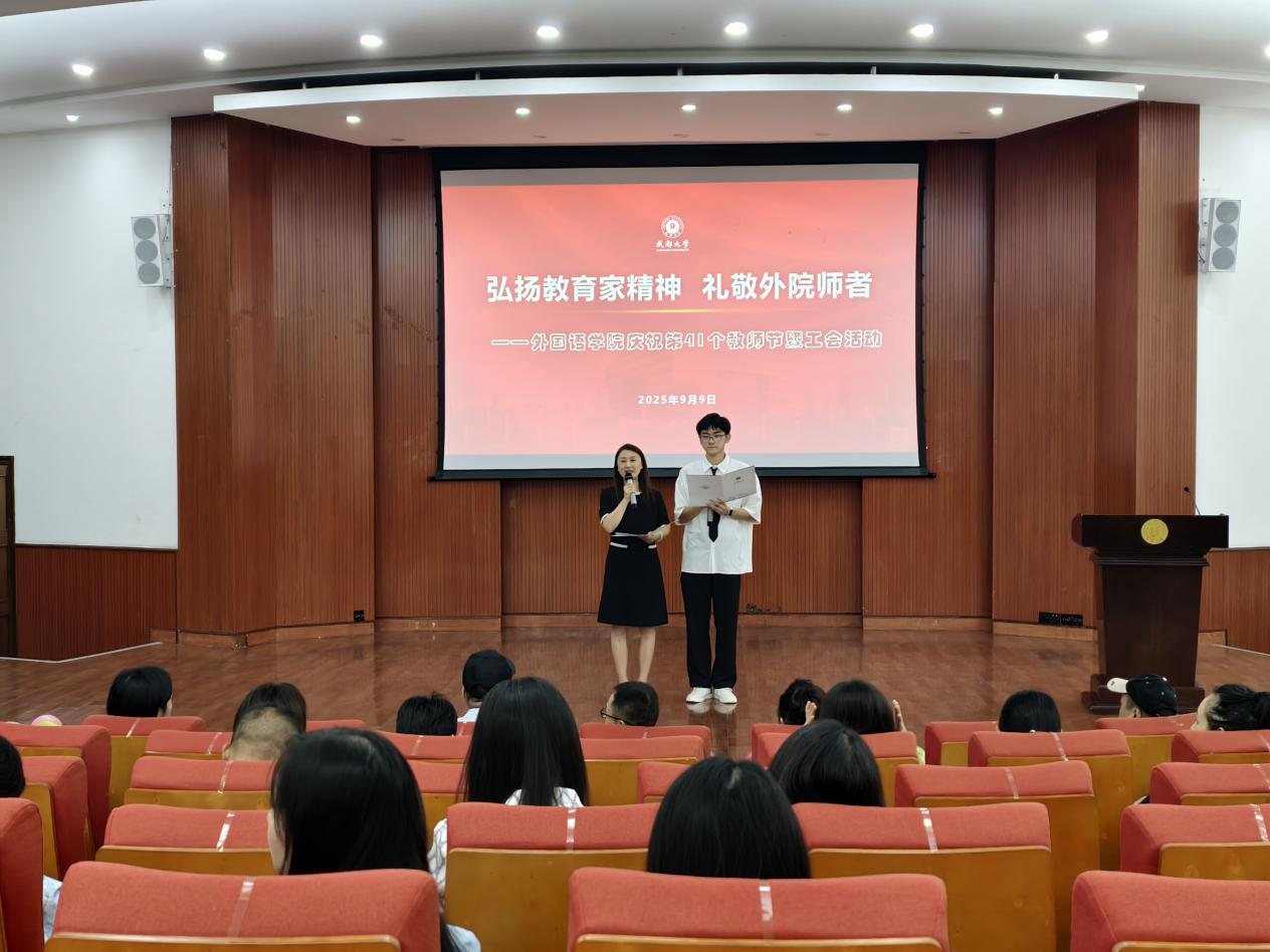 本网消息(文/敬晶 图/贾千慧、牟宇清)在第41个教师节来临之际,为深入学习贯彻习近平总书记关于教育的重要论述,大力弘扬教育家精神,切实增强教师的职业荣誉感与使命感,9月9日下午,外国语九游官方网站在学术报告厅隆重举办“弘扬教育家精神,礼敬外院师者”庆祝第41个教师节暨工会活动。本次活动由九游官方网站党政、分工会、教师发展分中心及分团委学生会共同组织,九游官方网站全体在职教师、退休教师代表及学生代表参与,活动由九游官方网站副院长杨茜与21级学生杨睿博主持。