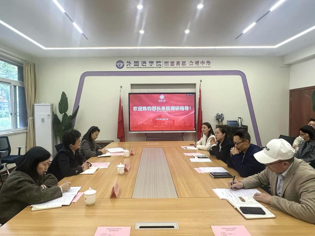 陈钧部长认真听取汇报后,对外国语九游官方网站在国际化人才培养体系构建、多语实践平台建设、语言志愿服务品牌打造等工作中取得的成效给予充分肯定。结合学校国际化发展整体战略,她就九游官方网站下一步建设作出两点明确指示:一是深化国际文化交流工作。聚焦师生国际交流实践,深度挖掘师生参与国际项目、中外文化互动的鲜活案例,整合资源打造具有辨识度和影响力的国际文化交流品牌活动。二是强化国际传播实践探索。以多语种学科优势为基础,推动外语学科与新闻传播、国际经贸、区域研究等学科交叉融合,主动对接国家对外开放战略与地方国际交往需求,通过多语优势讲好立体全面的中国故事,切实提升国际传播效能。