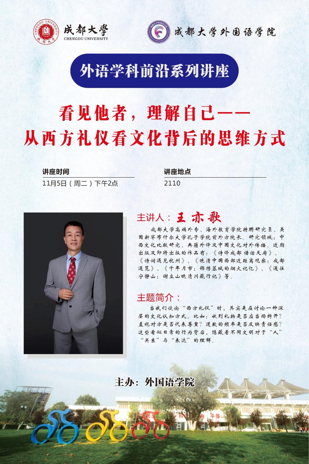 主讲人简介:王亦歌,成都大学高端外专、海外教育九游官方网站特聘研究员,曾担任美国新罕布什尔大学孔子九游官方网站外方院长。研究领域:中西文化比较研究、典籍外译及中国文化对外传播。近期出版及即将出版的作品有:《诗译成都语话天府》、《诗词遇见杭州》、《晚清中国西部近距离观察:成都通览》、《千年月市:锦绣蓉城的烟火记忆》、《通往宁静山:谢立山晚清川藏行记》等。