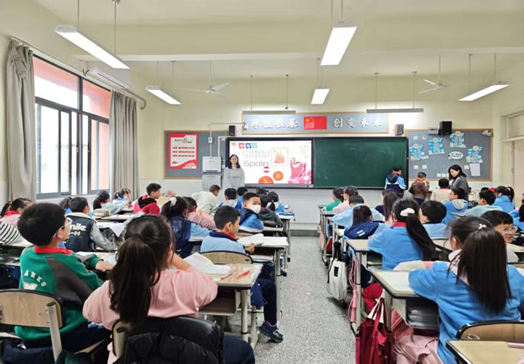 23级英语一班刘婷婷小老师走进附小四年级三班,带来一堂充满激情与色彩的西班牙文化国际视野课。课堂以“欧洲西南角的阳光国度”为开篇,刘老师用“伊比利亚半岛的热情明珠”的生动比喻,结合地图让孩子们快速锁定西班牙的地理位置,瞬间点燃探索兴趣。国旗环节中,孩子们化身“色彩侦探”,在老师引导下解密红黄两色的寓意——红色象征勇气,黄色代表富饶,还了解了国徽背后五个王国的历史故事。最热闹的“文化体验坊”上,一段弗拉门戈舞视频让孩子们跃跃欲试,大家模仿舞者拍手跺脚,感受节奏里的激情与力量。在“云打卡”圣家族大教堂、阿尔罕布拉宫时,孩子们惊叹于建筑的宏伟与精巧。番茄节的“红色狂欢”、奔牛节的勇敢挑战,让课堂充满欢声笑语,还有瓦伦西亚烩饭的金黄色泽、吉事果搭配巧克力酱的香甜、入口即化的西班牙火腿,更是让孩子们纷纷表示“想立刻品尝”。互动环节中,孩子们分享自己喜欢的西班牙美食与节日,趣味问答让知识巩固更高效。课堂尾声,一段番茄节狂欢与弗拉门戈表演混剪视频将气氛推向高潮。这堂兼具知识性与趣味性的课程,不仅让孩子们领略了西班牙的多元文化,更在心中种下了探索世界的种子。
