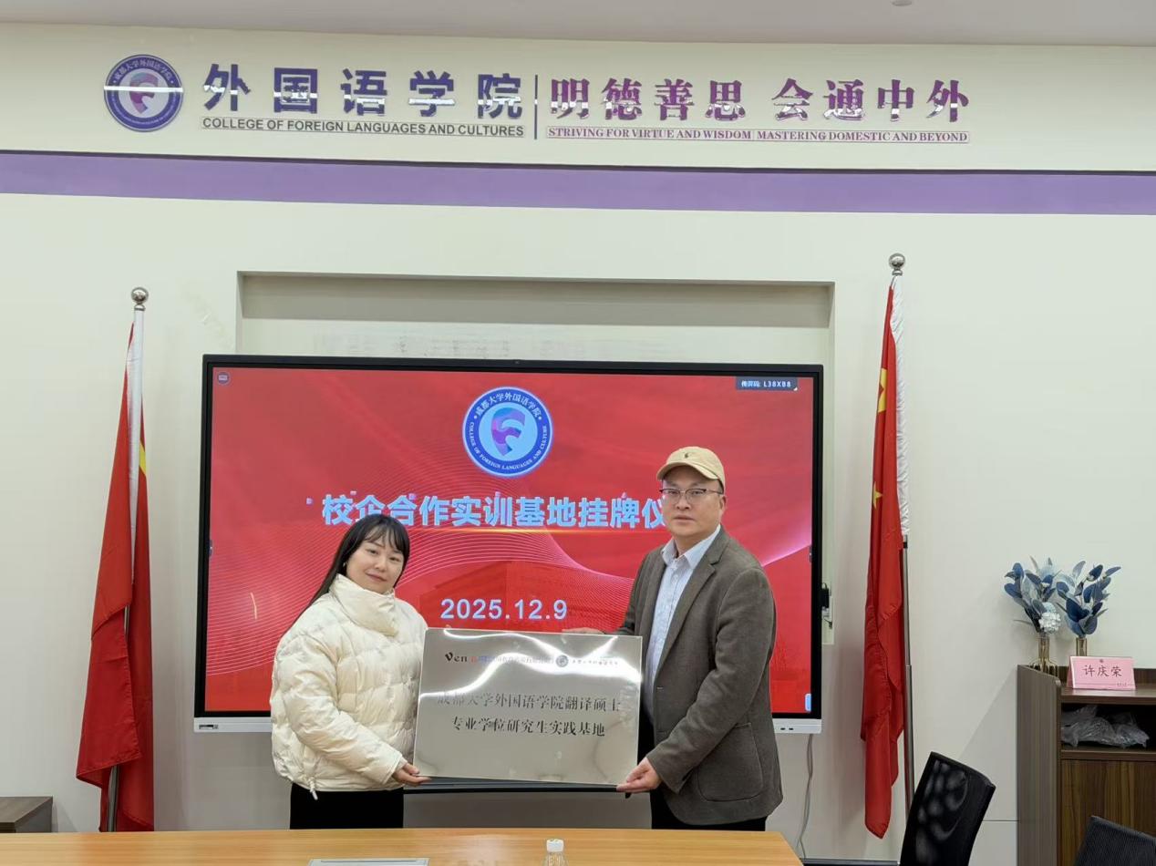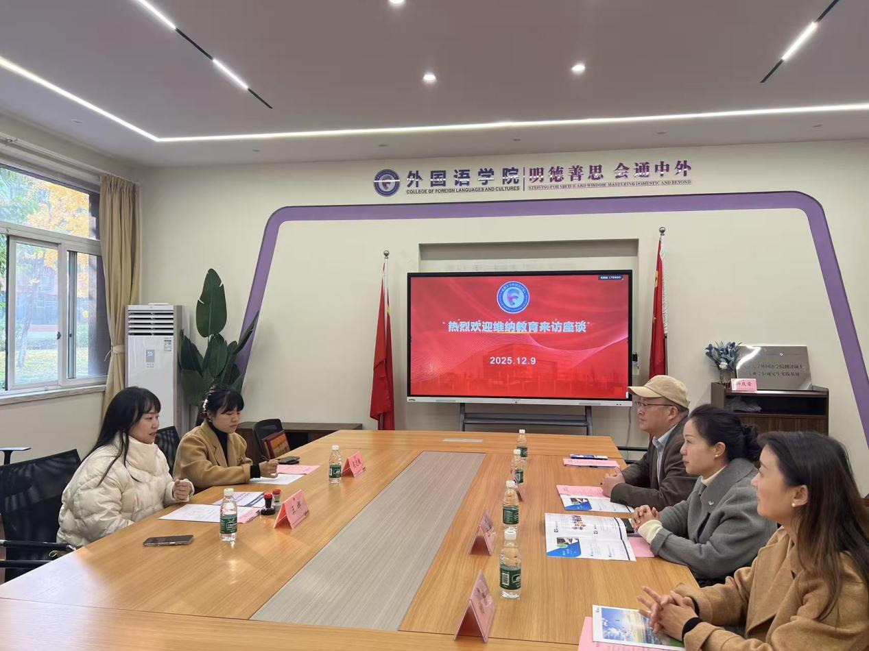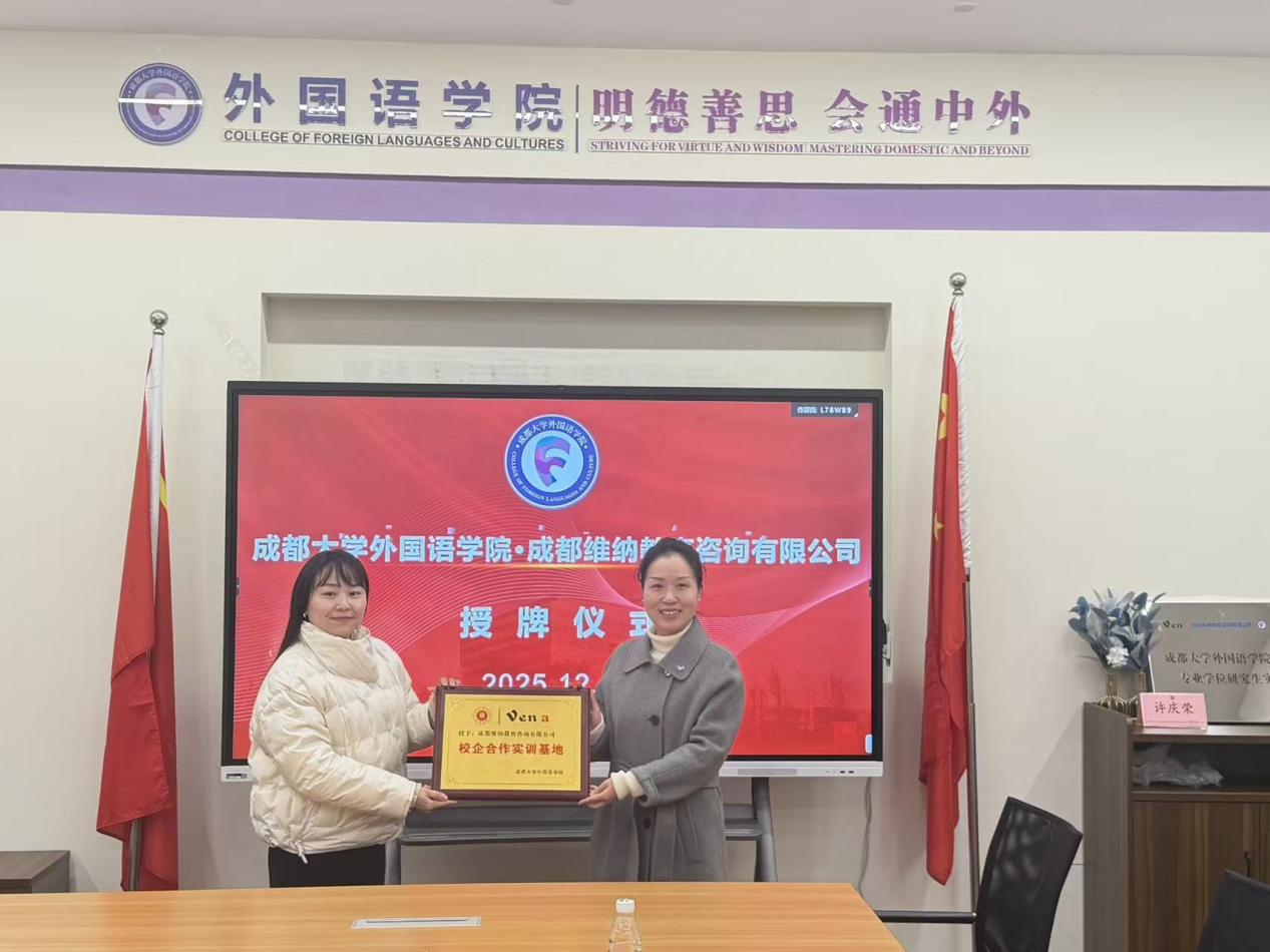 本网消息(图:杨蓓;文:周怡乔)2025年12月9日,九游官方网站在2110会议室举行校企合作签约仪式,与成都维纳教育咨询有限公司共建实训基地。九游官方网站领导班子及系部科室负责人与维纳教育总经理王娜一行,围绕产教融合赋能外语人才培养展开深度研讨。签约仪式由教学副院长姚连兵教授主持。