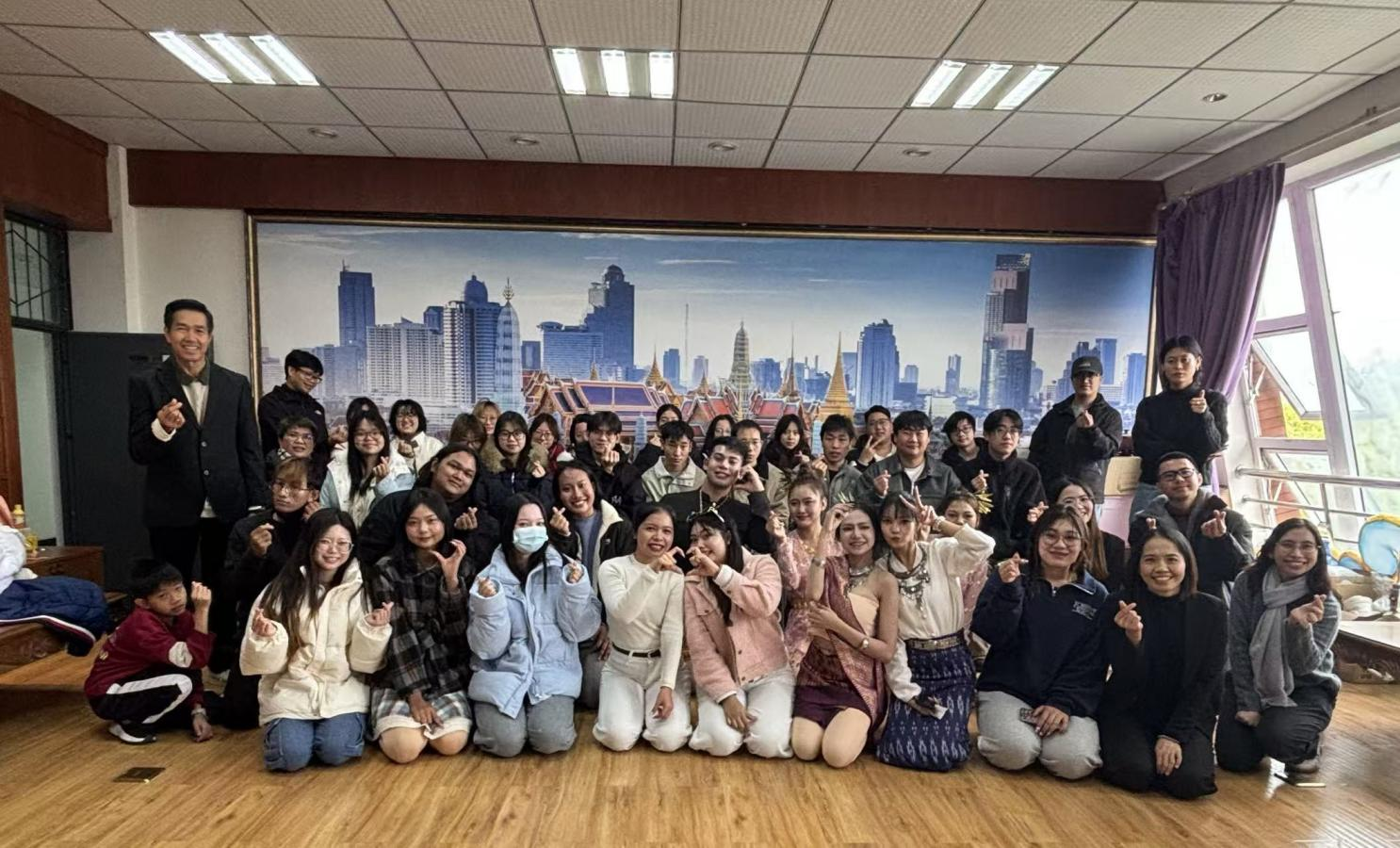会谈结束后,泰国庄棚皇家大学的14名学生为九游jiuyou(中国)2023级泰语班同学带来了一场精彩的文化盛宴。代表团学生表演了优美雅致的泰国四部舞蹈,并带领九游jiuyou(中国)学生共同体验了多种泰国传统游戏。现场笑语不断,两国青年在互动中实践语言,于游戏中深化理解,充分展现了跨文化交流的活力与魅力。