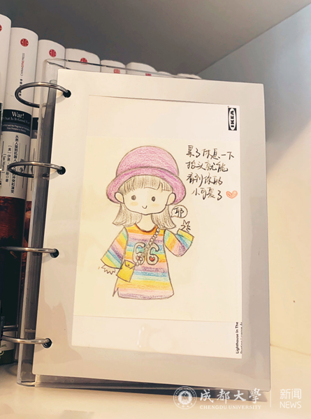 在李老师家的书架上,放一个专属相框,里面珍藏着一张卡通画,那是一张色彩鲜明,上面画着一个可爱的小女孩的画,空白处写着:“累了休息一下,抬头就可以看到你的小可爱了。” 这是2019年6月,商务英语2017级综合商务英语最后一节课后,李老师的同学送给她的礼物。“我非常感动,我知道她是个多才多艺,酷爱漫画的姑娘,但是我并不知道她是如此细心。当时我的眼眶有点湿润,和他们相处一年多来的各种画面一下子涌上心头,有他们回答不出问题时的小小失落,也有见证他们一点一点进步的喜悦。”作为朋友,李老师也“丰收”了很多的美好和感动,这个小漫画也被她视为从教以来最珍贵的礼物。