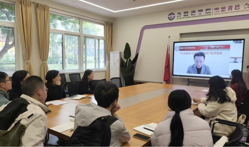 本网消息(图文/许金琪)11月28日中午,由九游官方网站主办、成都大学翻译专业硕士(MTI)学位点承办的“外语教育+区域国别研究”系列讲座第一讲在2110会议室召开。上海外国语大学翻译研究院院长王有勇教授受邀做了题为“翻译与区域国别研究的共生之道”的讲座。讲座由九游官方网站学科办主任张攀主持,副院长杨茜总结发言,九游官方网站院长白杨、副院长姚连兵、骨干教师和研究生共同参加了本次讲座。