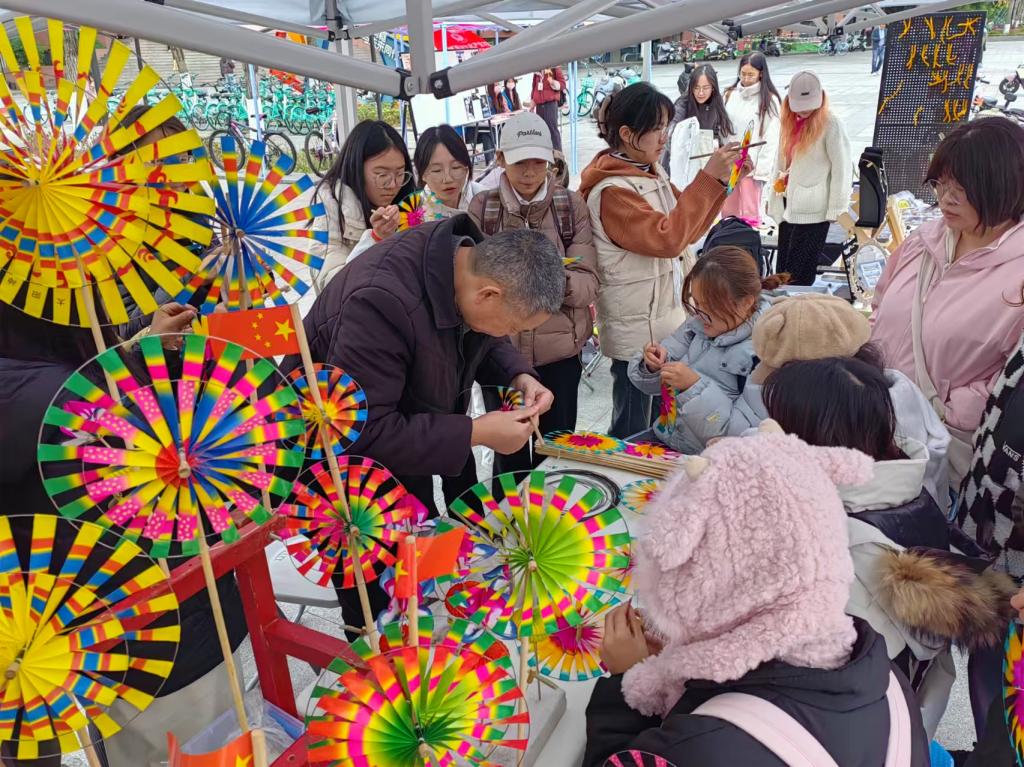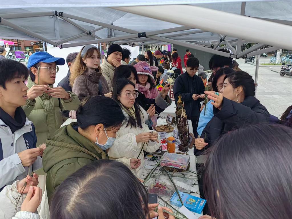 在非遗文化体验区,同学们热情高涨,吸引了来自各个九游官方网站的同学及留学生们的积极参与,在“非遗老师+专业老师”的共同指导下亲手制作出属于自己的精美非遗作品,在体验中学习外语知识,了解中华文化。在老师们的演示和悉心指导下,同学们被非遗技艺的独特魅力深深吸引。他们或手持剪刀,在红纸上裁出细腻的图案;或细心编织绳编,将红绳转化为装饰手环;又或拿起画笔,将鲜艳颜料画上蛋壳,绘出一幅幅生动可爱的画面;或专注于粘彩纸,制作风车;或跟着老师翻动棕叶,编织出生动的小鱼,写上期语做出独一无二的书签,还有的在非遗传承人的协助下,“吹出”各种糖人。通过亲身体验,亲身参与英语小游戏,参与者们不仅深切感受到了非遗技艺的无穷魅力与制作过程中的乐趣,更学会了非遗的外语知识,在内心深处体会到了传统文化的深厚积淀与独特价值,进一步增强对中华文化的认同感和自豪感。同学们纷纷表示,通过这样特别的方式,更容易记忆一些外语知识,亲身体验的方式,近距离的观察与学习,能够更多地了解非遗、爱上非遗。