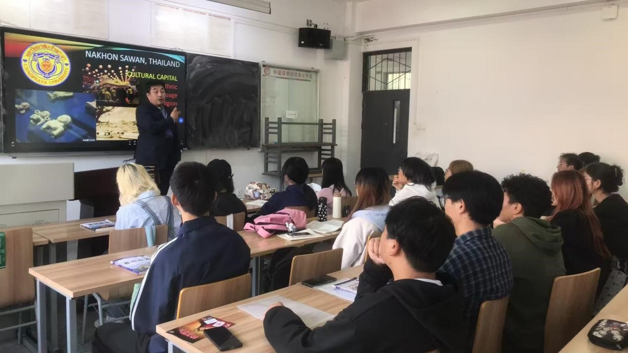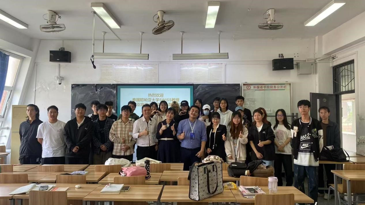 在第一场讲座中,泰国昭帕亚大学的专家Swiss教授以中泰双语为媒介,为师生们带来了一场关于泰国及东南亚文化特色的深度解读。讲座内容涵盖了语言概论、文化遗产、语言多样性以及语言学的核心要素等多个方面。Swiss教授特别强调了词汇的深层含义和语言间的借词现象,帮助学生们更好地理解泰国文化的内涵与外延。