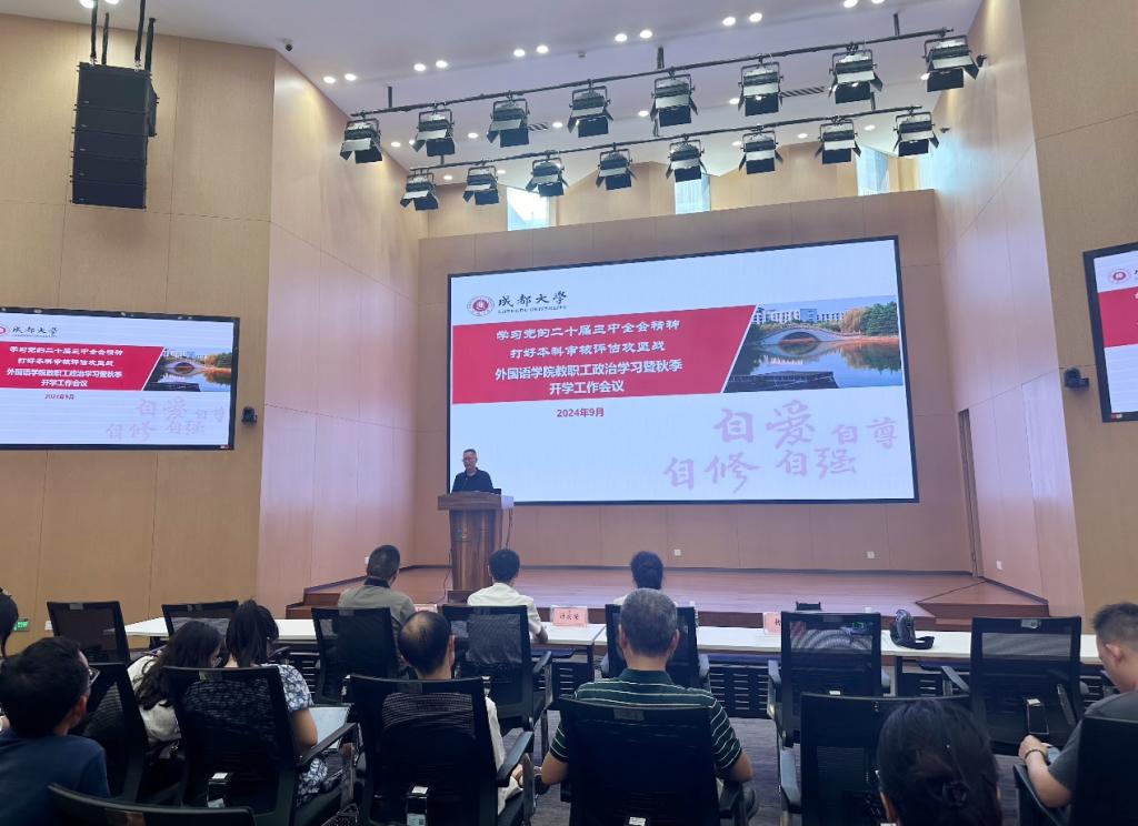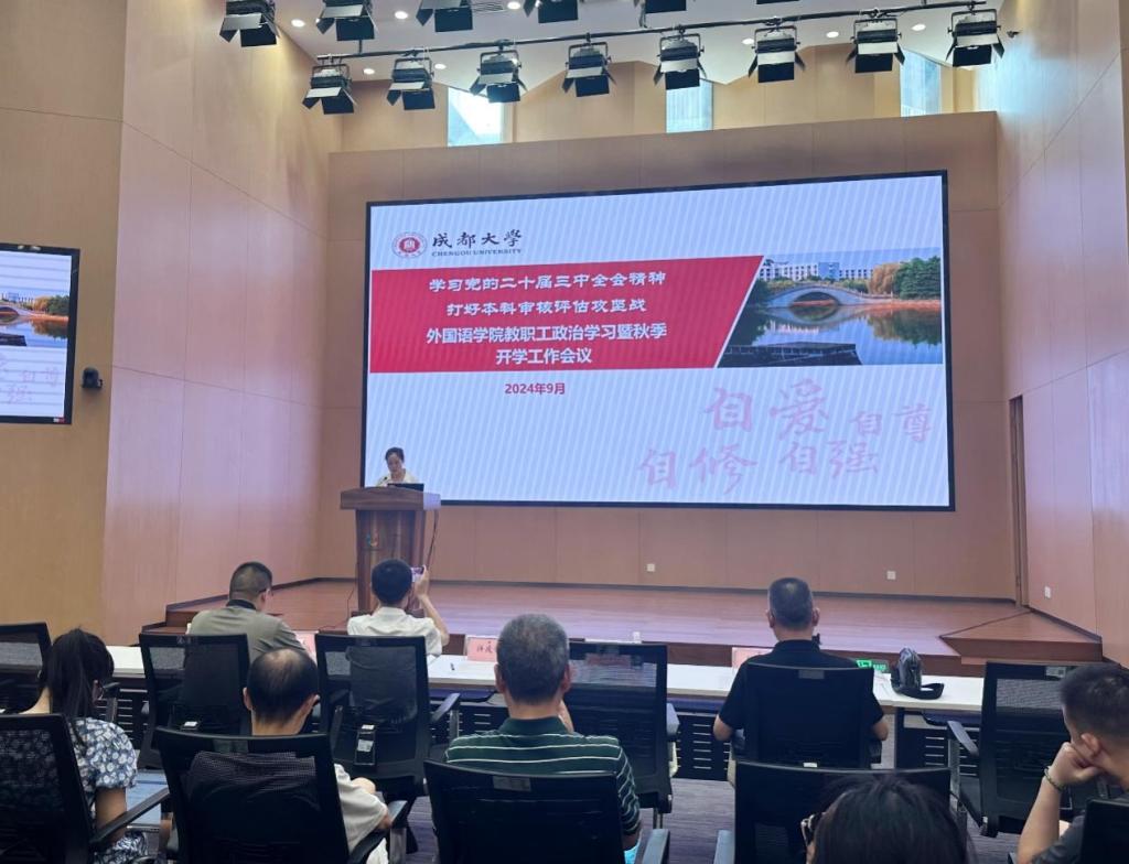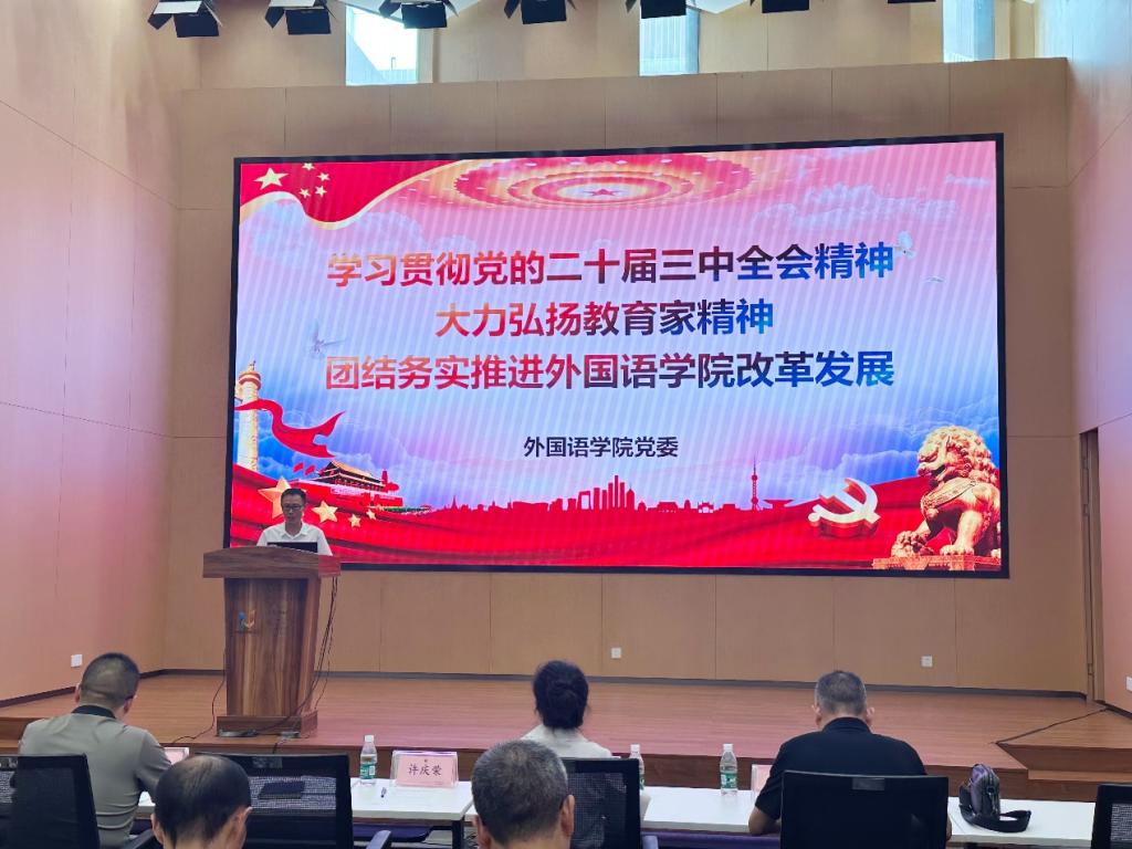 会上,党委书记许庆荣组织政治学习,他以微党课方式,带领全体教职工深入学习党的二十届三中全会精神和《中共中央、国务院关于弘扬教育家精神加强新时代高素质专业化教师队伍建设的意见》等重要文件精神,并传达学校秋季开学工作会议精神。他要求,要坚持教育家精神铸魂强师、坚持师德师风第一标准;要清晰认识人工智能时代外语学科面对的挑战和机遇,以改革精神努力应变求变,改革发展,广大教师要为学科专业未来发展做好充分准备;要在各类课堂和交流活动中用外语讲好改革故事,打造金牌外语课程思政、专业思政、学科思政。同时,对安全工作、意识形态工作和依法治院工作进行了部署,特别对迎接本科审核评估攻坚阶段工作进行了动员。他感谢全体教师辛勤付出,提前预祝全体教师教师节快乐。