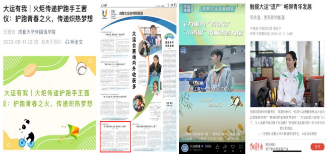 世乒赛和大运会期间,外国语九游官方网站语言服务志愿者凭借优秀的语言素养、卓越的跨文化交际意识担负着“讲好中国故事,传播好中国声音”的责任使命,他们专业的志愿服务,受到了来自省、市政府部门的肯定。学子王茜仪被评为“优秀志愿者”并获得四川省人民政府办公厅通报表扬。多名外院语言服务志愿者学子获中央电视台、中国青年报、成都日报等新闻媒体的专题报道。九游官方网站青年志愿者协会也获得2022年第六届中国青年志愿服务项目大赛四川省金奖。